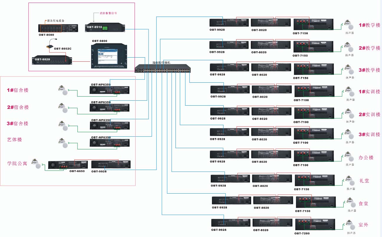 IP網絡廣播系統與醫院各大樓的消防系統連接,消防中心的干節點信號傳遞到廣播系統的消防智能接口進行聯動報警。報警聲自動屏蔽背景音樂聲,報警模式可預先設定,本層有消防信號本層報警,或本層有消防信號,鄰近上下兩層也跟著一起報警。
